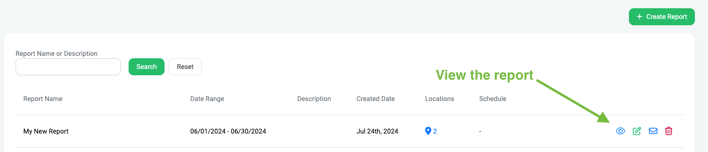 Your new report will now show up in the list of reports on the main Reports page, simply click on the “eye” icon to view your report: