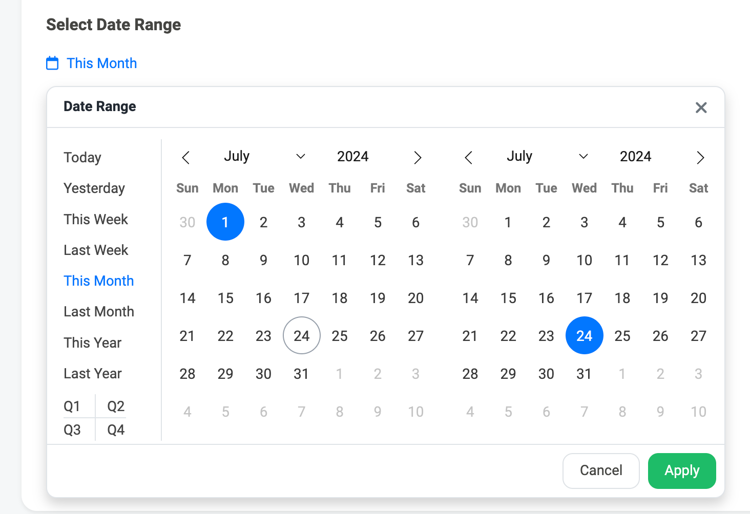 In the Select Date Range section, clicking on the “This Month” link will open a calendar view that allows you to select which dates should be included in the report: