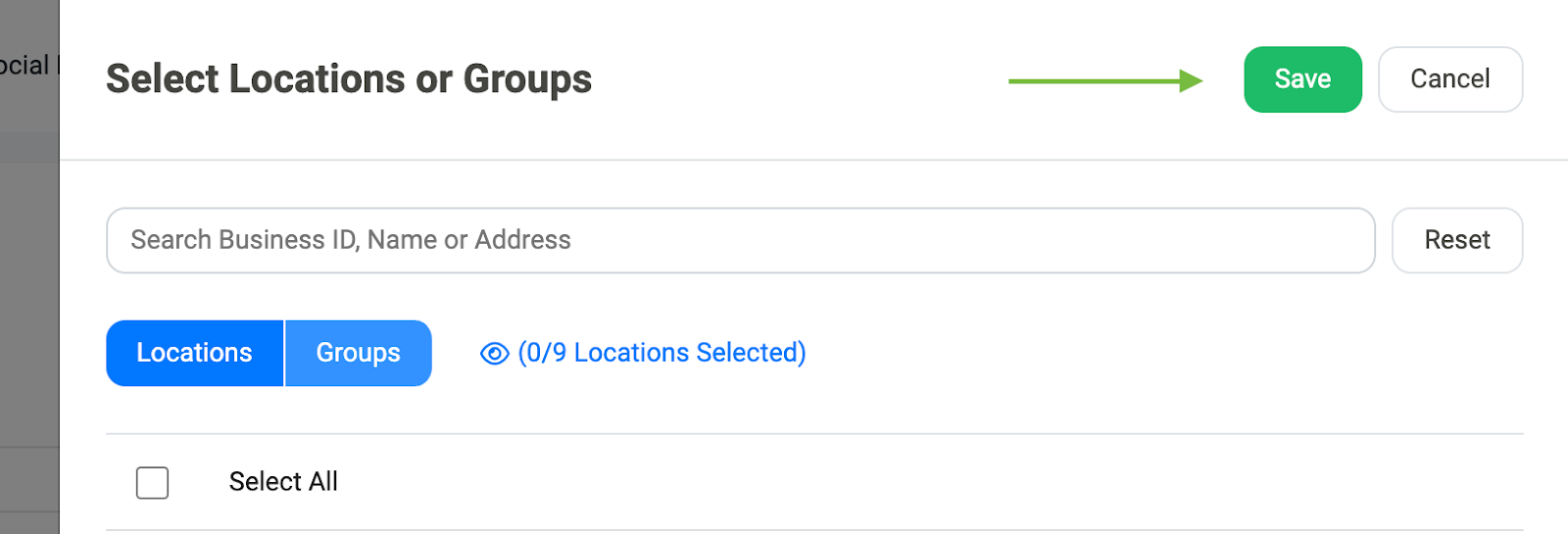 Once you have selected all of the locations or groups that you want to include in your report, click on the Save button in the top right corner of the Select Locations or Groups tab: