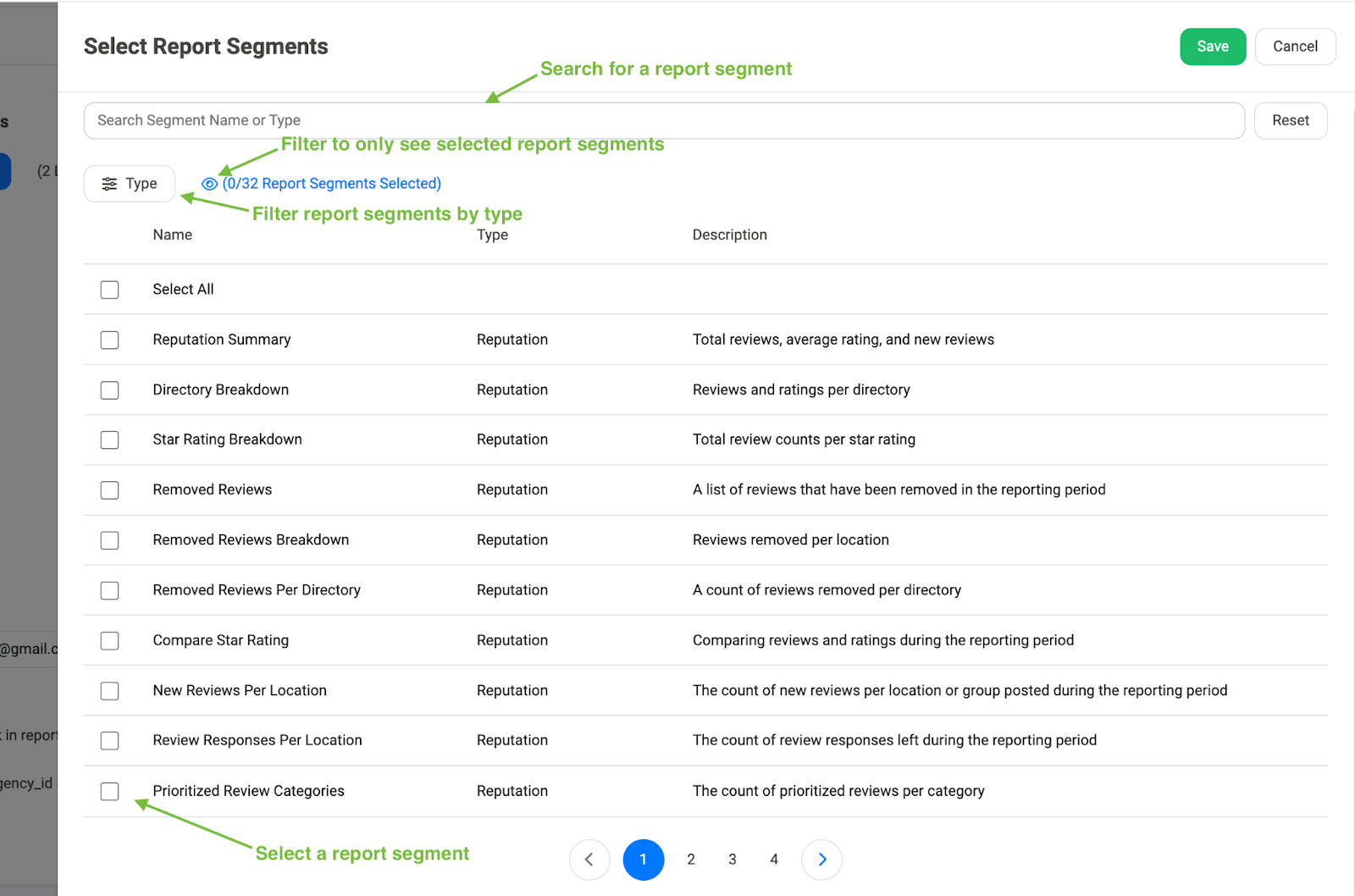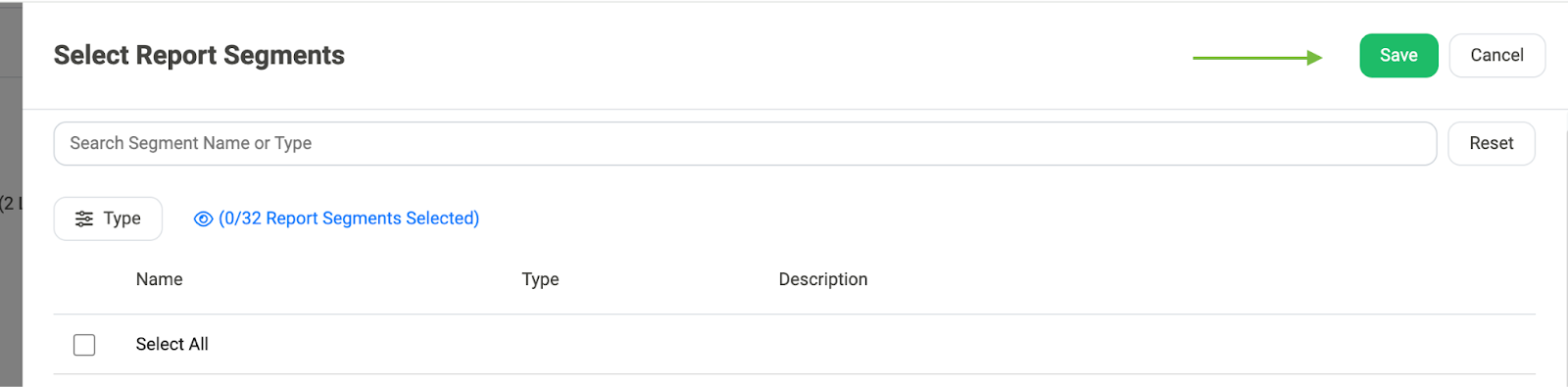 Once you have selected the report segments that you want to include, click on the Save button in the top right corner of the Select Report Segments tab: