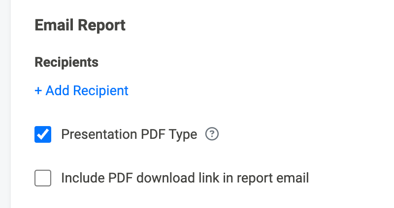 There are also a few options related to PDF exports of the report in this section. One checkbox allows you to include a PDF download link in the email, The other checkbox allows you to toggle between the “Presentation PDF type” that is a shortened version of the report PDF and only includes a subset of the report data (leaving this unselected includes the full version of the data in the PDF).
